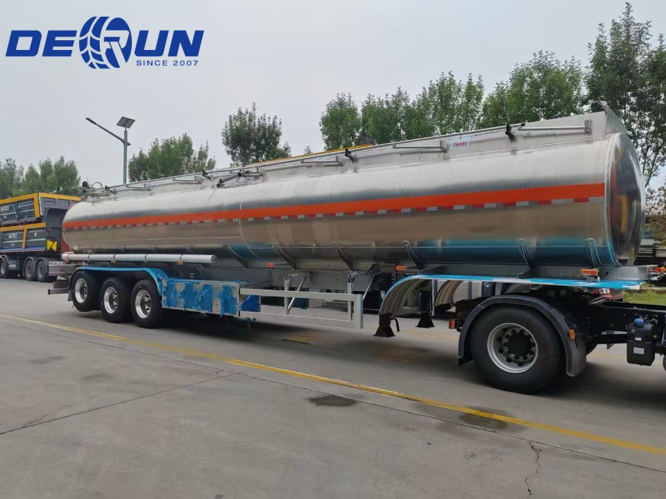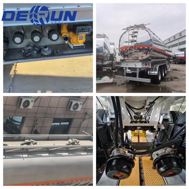 డెరున్ త్రీ-యాక్సిల్ అల్యూమినియం అల్లాయ్ ఆయిల్ ట్యాంక్ సెమీ ట్రైలర్లో అల్యూమినియం మిశ్రమం నుండి తయారైన ట్యాంక్ బాడీ ఉంది, తేలికపాటి నిర్మాణం మరియు తుప్పు నిరోధకతను అందిస్తుంది. అంతర్గత యాంటీ-స్లోష్ ప్లేట్లు మరియు కంపార్ట్మెంట్లు ద్రవ కదలికను సమర్థవంతంగా అణిచివేస్తాయి, రవాణా సమయంలో స్థిరత్వాన్ని పెంచుతాయి. పైభాగంలో మ్యాన్హోల్ కవర్ మరియు ఆవిరి రికవరీ ఇంటర్ఫేస్ ఉన్నాయి, అయితే దిగువ న్యూమాటిక్ ఎమర్జెన్సీ బ్రేక్ వాల్వ్ను కలిగి ఉంటుంది, అన్నీ అర్జెంటీనా లోడింగ్ మరియు అన్లోడ్ నిబంధనలకు అనుగుణంగా ఉంటాయి. తెల్లటి ప్రతిబింబ పూత సూర్యరశ్మి నుండి ఉష్ణోగ్రత పెరుగుదలను తగ్గిస్తుంది, ఇంధన బాష్పీభవన నష్టాలను తగ్గిస్తుంది. ట్యాంక్ తోకలో ద్రవ స్థాయి సెన్సార్ల కోసం రిజర్వు చేసిన ఇంటర్ఫేస్ ఉంటుంది, వినియోగదారులచే ఇంటెలిజెంట్ మానిటరింగ్ సిస్టమ్స్ యొక్క భవిష్యత్తులో సంస్థాపనను సులభతరం చేస్తుంది.
